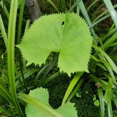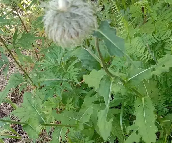 山牛蒡 多年生草本,高0.7-1.5米。根状茎粗。茎直立,单生,粗壮,基部直径达2厘米,上部分枝或不分枝,全部茎枝粗壮,有条棱,灰白色,被密厚绒毛或下部脱毛而至无毛。基部叶与下部茎叶有长叶柄,叶柄长达34厘米,有狭翼,叶片心形、卵形、宽卵形、卵状三角形或戟形,不分裂,长10-26厘米,宽12-20厘米,基部心形或戟形.或平截,边缘有三角形或斜三角.形粗大锯齿,但通常半裂或深裂,向上的叶渐小,卵形、椭圆形、披针形或长椭圆状披针形,边缘有锯齿或针刺,有短叶柄至无叶柄。全部叶两面异色,上面绿色,粗糙,有多细胞节毛,下面灰白色,被密厚的绒毛。