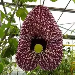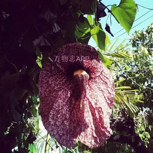 形态特征:大型木质藤本,茎粗糙,具棱。蔓可长达10米。叶互生,卵状心形,全缘,顶端尖,基部心形,具叶柄,着于老茎上,花大,紫褐色,具白色斑点。