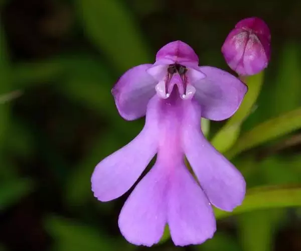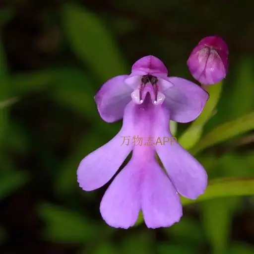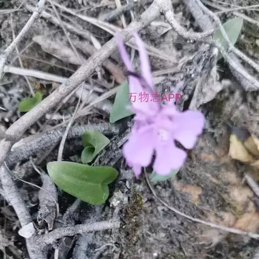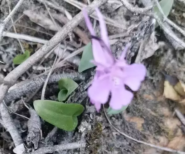植株高7-16厘米。块茎卵球形,直径1-1.5厘米,肉质。茎纤细,直立,光滑,基部具1-2枚筒状鞘,近基部具1枚叶,在叶之上有1-2枚苞片状披针形的小叶。叶片线状倒披针形、舌状长圆形、狭椭圆形至长圆状卵形,长1.5-8厘米,宽6-12毫米,先端稍尖,基部成抱茎的鞘。花序具1朵(极罕2朵)花;花苞片狭窄,线状披针形,先端渐尖,较子房短很多,几乎不超过子房长的1/2;子房圆柱形,细长,稍扭转,弓曲,无毛,连花梗长1-1.7厘米;花在属中最大,玫瑰红色或紫红色;中萼片卵形,长6-7毫米,宽约4毫米,直立,凹陷呈舟状,先端急尖,具1脉;侧萼片斜卵状披针形,反折,长8毫米,宽约4毫米,先端急尖,具2-3脉,且有分枝脉;花瓣斜卵形,直立,较中萼片短而较宽,先端钝,与中萼片靠合,具3脉;唇瓣向前伸展,扇形,长11-15毫米,宽13-19毫米,基部楔形,具爪,具距,前部3裂;侧裂片卵状楔形,伸展;中裂片较侧裂片稍小,倒卵状楔形,边缘全缘或中部具浅凹缺;距圆锥形,下垂,长15-17毫米,稍弯曲,向末端渐狭,末端尖,与子房等长或长于子房;蕊柱极短,直立;花药卵球形,向后倾斜,先端钝,2室,药室卵形,并行;花粉团近球形,具长而扁的花粉团柄和粘盘,粘盘近卵形;蕊喙小,直立,三角形;柱头2个,隆起,狭长圆形,从蕊喙之下向外伸出;退化雄蕊2个,小,椭圆形。花期4-5月。