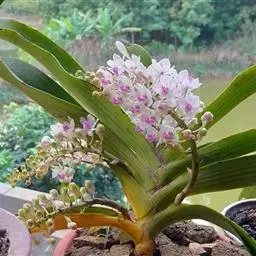指甲兰是兰科指甲兰属植物。其茎粗壮;叶带状;总状花序疏生数朵花;萼片和花瓣淡白色,…