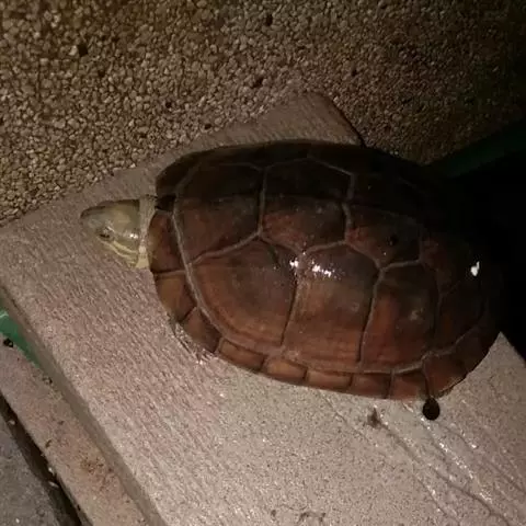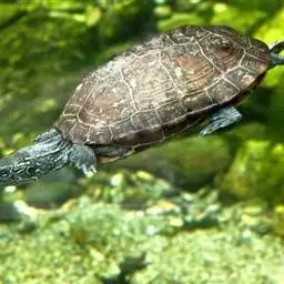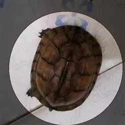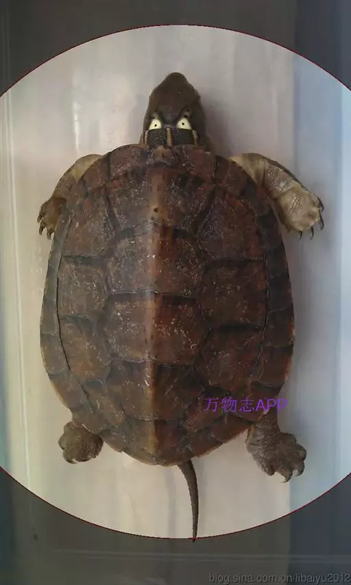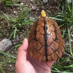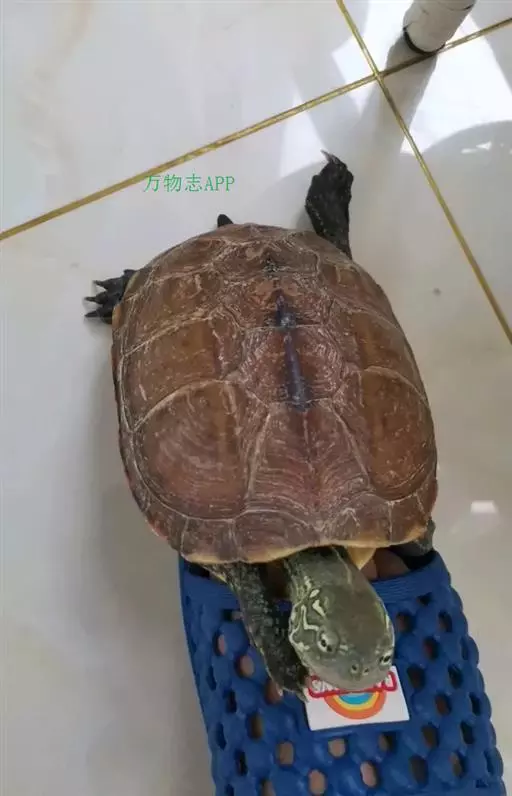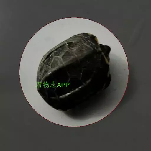 乌龟(学名:Mauremys reevesii)是龟科、拟水龟属爬行动物。头小,不及背甲宽的1/4,头顶前部平滑,后部皮肤具细粒状鳞;吻端向内侧下斜切,喙缘的角质鞘较薄;下颚左右齿骨间的交角小于90°。背甲较平扁,具3条纵棱,四肢略扁平,指、趾间均具蹼,具爪。尾较短小。背甲棕褐色,腹甲及甲桥棕黄色,每一盾片均有黑褐色大斑。头部橄榄色或黑褐色;头侧及咽部有喑色镶边的黄纹及黄斑,并向后延伸至颈部。雄性个体几乎整个呈黑色,有异臭,雌龟背甲棕褐色。