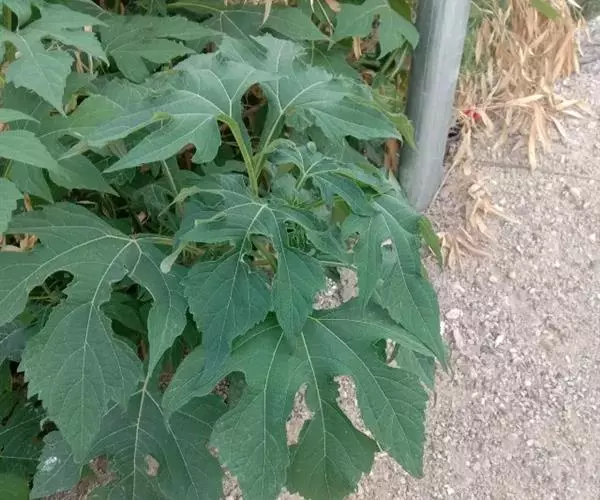 一年生草本,高2-5米。茎直立,有粗壮的分枝,被稠密的短柔毛或通常下部脱毛。