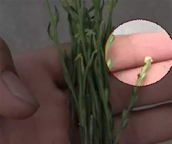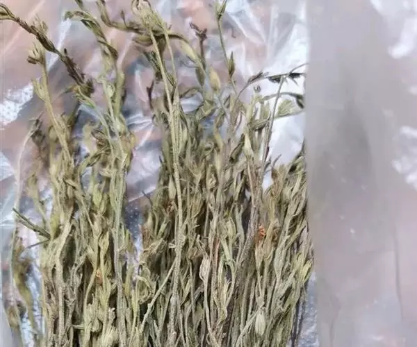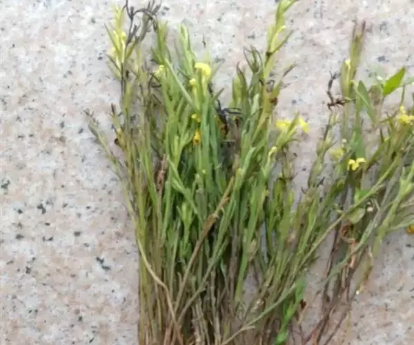 为一年生小草本,半寄生,高6~25厘米,全株粗糙,且被硬毛;茎多呈四方形,有2条纵沟,不分枝或在基部略有分枝。叶生于下部的对生,上部的互生,无柄,叶片线形或狭卵形,长5~12毫米,宽1~2毫米,但最下部的叶常退化成鳞片状。茎单一或间有下部分枝,纤细,长3~15厘米,灰褐色,被粗糙短毛,茎部生稀疏微细须根,质稍柔韧。叶小,互生,线形或披针形,上部叶较大,长4~10毫米左右,常贴生于茎上,下部叶小,鳞片状。花黄色或紫色,腋生或排成稀疏穗状花序;苞片明显,长于萼;气无,味淡。以色灰黑、柔嫩、带花穗者为佳。气无,味淡。