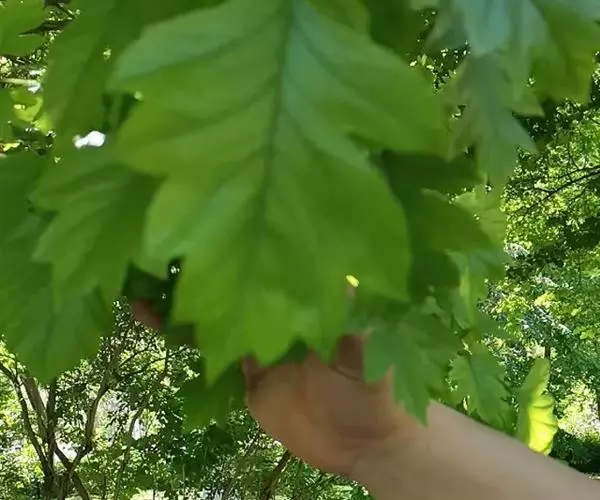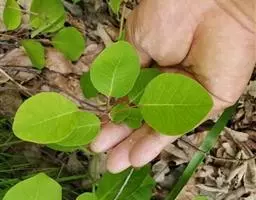 粉背黄栌叶卵圆形,较大,长3.5-10厘米,宽2.5-7.5厘米,无毛,但叶背显著被白粉;叶柄较长,…