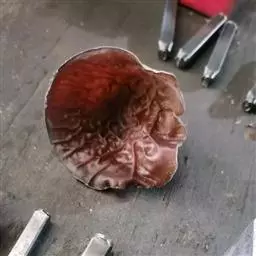 实体初期杯状,渐变为耳状至叶状,胶质、韧,干后软骨质,大部平滑,基部常有皱褶,直径10-15cm,干后强烈收缩。不孕面灰褐色至红褐色,有绒毛,(500-600)μm(4.5-6.5)μm,无色,仅基部带褐色。子实层面紫褐色至近黑色,平滑并稍有皱纹,成熟时上面有白色粉状物即孢子。孢子无色,肾形,(13-18)μm×(5-6)μm。