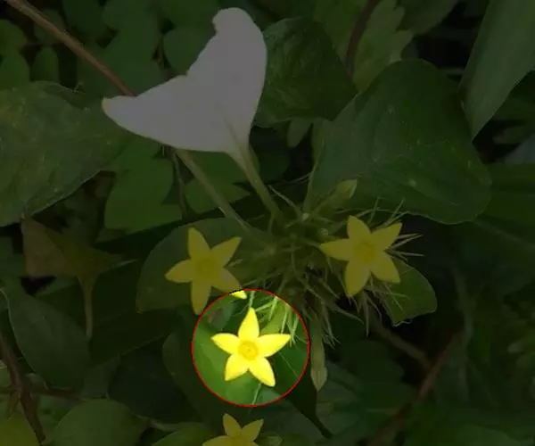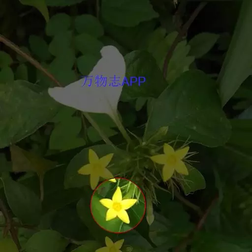 花单生叶腋;花梗丝状,长1.5-7厘米,密被柔毛;花萼长5-7毫米,分裂近达基部,裂片线状披针形,先端渐尖,背面被短毛;花冠金黄色,辐状,直径1.2-2厘米,基部合生约1.5毫米,裂片卵状椭圆形至椭圆状披针形,长6-8毫米,宽3.5-6毫米,先端锐尖,有稀疏红色或褐色腺点;花丝长3-4毫米,基部合生成宽而浅的环;花药线形,长约2毫米;花粉粒具3孔沟,近长球形[ (23.5-26.5) × (20-22.5) 微米],表面具网状纹饰;子房无毛,花柱长约5毫米。