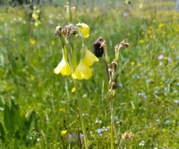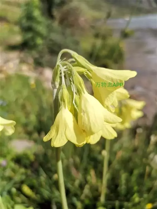 钟花报春(学名:Primula sikkimensis Hook. f.):报春花科、报春花属多年生草本植物。根状茎粗短,多数纤维状须根。叶片椭圆形至矩圆形或倒披针形,先端圆形或有时稍锐尖,上面深绿色,下面淡绿色,中肋宽扁,网脉极纤细;叶柄甚短。花葶稍粗壮,顶端被黄粉;伞形花序,多花,苞片披针形或线状披针形,花萼钟状或狭钟状,裂片披针形或三角状披针形,花冠黄色,乳白色,蒴果长圆体状,6月开花,9-10月结果。