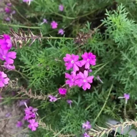 茎基部稍木质化,甸甸生长, 节部生根。株高20一3 0厘米, 枝条细长四棱, 微生毛。叶对生, 二回羽状深裂,裂片线性, 两面疏生短硬毛, 端尖, 全缘, 叶有短柄。穗状花序顶生,开花呈碎状花序顶生短缩呈伞房状,多数小花密集排列其上,花冠筒状,花色丰富,有白、粉红、玫瑰红、大红、紫、蓝等色,花期4-10月,经久不败。