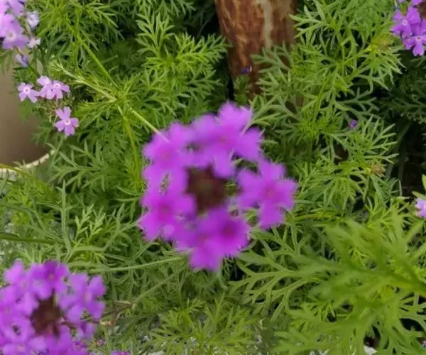 细叶美女樱具有匍匐茎,枝条柔软,枝叶纤细、花朵致密,宜于在各类栽植器中做多种造型,既可用于美化街道及各种建筑物,又适于家庭悬挂,装扮居室,是一种花叶共赏的新型垂带植物。
