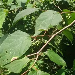 落叶灌木或小乔木,高5-7米;树皮平滑,灰色或深灰色;小枝纤细,近圆柱形,常稍弯曲,略呈“之”字形,当年生枝淡黄褐色或灰色,近无毛;冬芽圆锥状卵圆形,鳞片三角状卵形,覆瓦状排列,外面有灰色短柔毛。叶纸质,近圆形,稀阔卵形或倒卵形,顶端钝尖,基部近于心脏形或圆形,长11-13(-18)厘米,宽8-11 (-18) 米,不分裂或稀分裂,分裂者裂片钝尖或锐尖至尾状锐尖,深仅达叶片长度1/3-1/4,稀1/2,边缘呈波状或钝锯齿状,上面深绿色,下面淡绿色,两面除沿叶脉或脉腋幼时有长柔毛或疏柔毛外,其余部分近无毛;主脉3-5条,由基部生出,常呈掌状,侧脉5-7对,和主脉相交成锐角,均在叶上面显著,下面微凸起,小叶脉仅在下面显著;叶柄长3.5-5(-10)厘米,圆柱形,稀上面稍扁平或略呈沟状,基部粗壮,向顶端逐渐细弱,有稀疏的短柔毛或无毛。聚伞花序生叶腋,长3-3.5厘米,通常有3-5花,总花梗长1.2-2厘米,花梗长1.5-2厘米,几无毛,花梗上有线形小苞片1枚,长5毫米,早落,外面有短柔毛;花篠近钟形,外面具稀疏短柔毛,裂片5,三角形,长和宽均约1毫米,花瓣6-7,线形,紫红色,外面有短柔毛,近基部较密,长2.5-3.5厘米,宽1-2毫米,基部粘合,上部开花时反卷;雄蕊6-7,较花瓣短,花丝略扁,长8-14毫米,微有短柔毛,花药长1.5-2.1厘米,药隔内面无毛,外面无毛或有疏柔毛;花盘肥厚,近球形,无毛,微现裂痕;子房1室,花柱粗壮,长2.6-3.6厘米,无毛,柱头扁平。核果长卵圆形或长椭圆形,长8-12毫米,直径4-8毫米,顶端有宿存的花萼裂片,有短柔毛或无毛,有种子1颗。花期3-7月,果期7-9月。