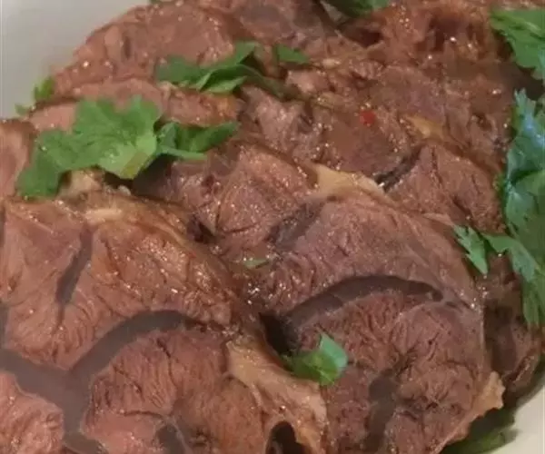 优质酱牛肉色泽酱红,油润光亮,肌肉中的少量牛筋色黄而透明;肉质紧实,切片时保持完整不会松散,切面成豆沙色;吃起来咸淡适中,酱香浓郁,酥嫩爽口,不硬不柴 。