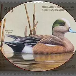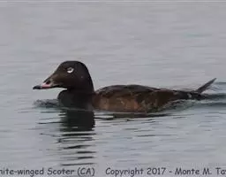 雌鸟头和项棕褐色,头顶和颈较暗,颏部有一三角形白色小斑,喉部亦杂有白色。上体暗褐色,腰和尾上覆羽黑褐色,背和肩具棕褐色羽缘。两翅同雄鸟,亦具宽阔的白色翼镜。上胸棕褐色,下胸灰白而杂以不明显的棕斑。上腹灰白色,下腹褐色,羽缘白色。两胁褐色,具棕色端斑,尾下覆羽白色。