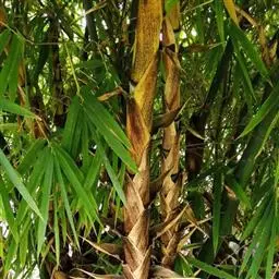 竹锈病:发病初期,竹叶背面发生橙黄色的夏孢子堆、突破叶的表皮外露,严重时夏孢子堆密集成片,引起大量落叶。防治方法:在5月间发病初期,将病枝砍下烧毁,并喷1%的波尔溶液。竹林如过度郁闭,应适度疏伐、使林内空气疏通,以免病虫发生。