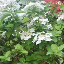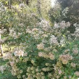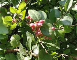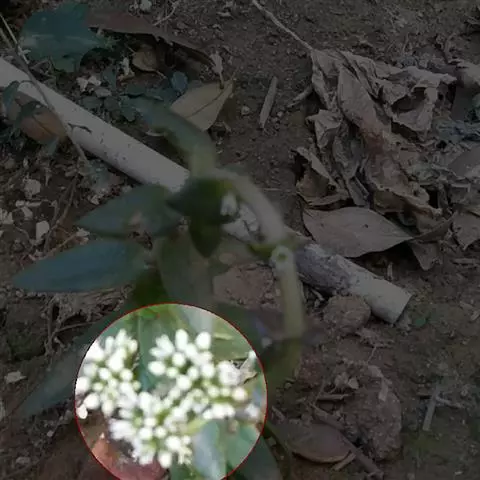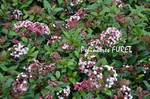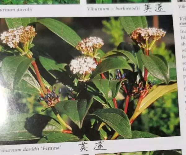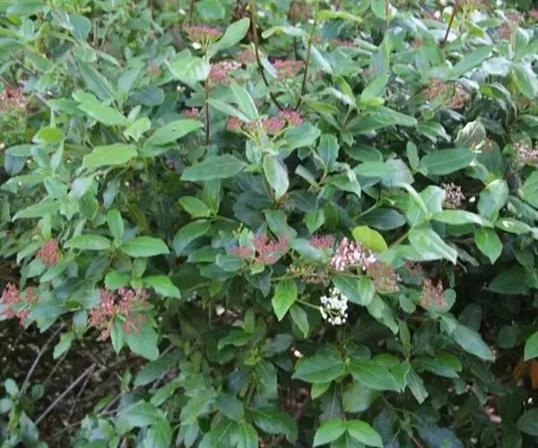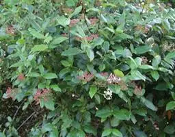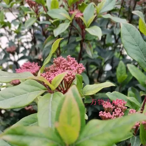 常绿灌木,树冠呈球形,冠径可达2.5一3米。叶椭圆形,深绿色,叶长10厘米,聚伞花序,单花小,仅0.6厘米,花蕾粉红色,花蕾绷很长,可达5个多月,盛开后花白色,整个花序直径达10厘米,花期在原产地从11月直到翌存4月。10月初便可见细小的黄绿色花蕾,随着花序的伸长,花蕾越来越密集覆盖于枝顶,颜色也逐步加深呈殷红色,远远望去像一片片红云,飘浮在墨绿色的树冠上,果卵形,深蓝黑色,径0.6厘米。