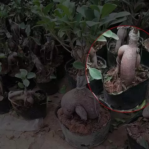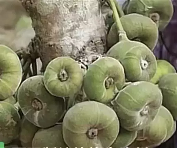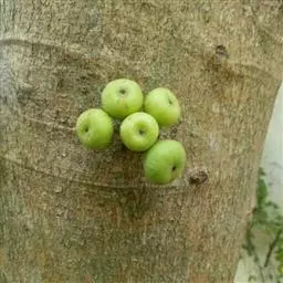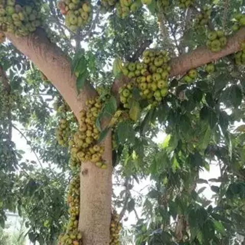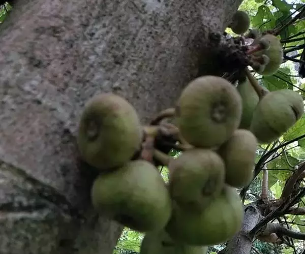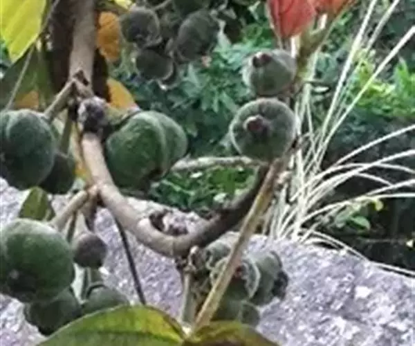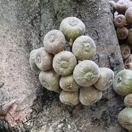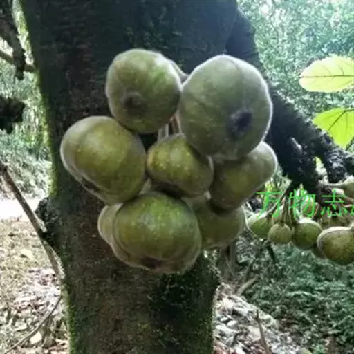 榕果簇生于树干基部或老茎短枝上,大而梨形或扁球形 至陀螺形,直径3-5 (-6)厘米,具明显的纵棱8-12条,幼时被白色短柔毛,成熟脱 落,红褐色,顶生苞片宽三角状卵形,4-5轮覆瓦状排列而成莲座状,基生苞片3枚,卵 状三角形;总梗长4-6厘米,粗壮,被柔毛;雄花,无柄,花被片3,匙形,薄膜质,透 明,雄蕊2,花药卵形,花丝长;瘿花花被片下部合生,上部3裂,微覆盖子房,花柱侧 生,被毛,柱头膨大;雌花,生于另一植株榕果内,有或无柄,花被片3裂,子房卵圆形, 花柱侧生,被毛,较瘿花花柱长。瘦果有粘液。花期8月至翌年3月,果期5-8月。