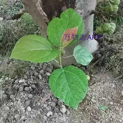 乔木或小乔木,高4-10米,胸径10-15厘米,榕冠广展。树皮灰褐色,粗糙,幼 枝被柔毛,直径10-15毫米,红褐色,中空。叶互生,厚纸质,广卵状心形,长15-55 厘米,宽15-27厘米,先端钝,具短尖,基部心形,稀圆形,边缘具整齐细锯齿,表面 无毛,仅于中脉及侧脉有微柔毛,背面多被开展短柔毛,基生侧脉5-7条,侧脉每边3- 4条,表面微下凹或平坦,背面突起;叶柄长5-8厘米,粗壮;托叶三角状卵形,长-1.5 2厘米,紫红色,外面被短柔毛。