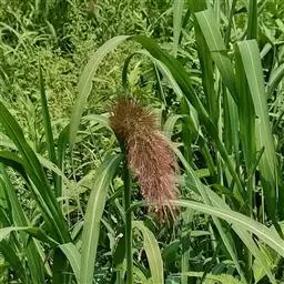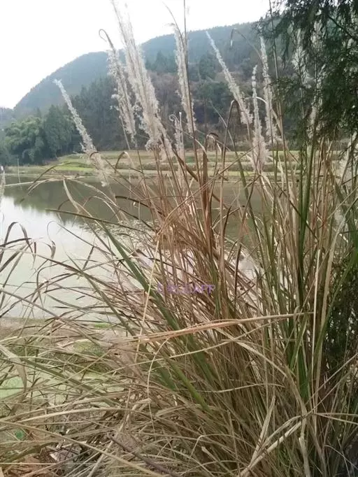 茎极狭,长约1m,宽约2cm,下垂,边缘具细齿,呈灰绿色,被短毛。圆锥花序大,雌花穗银白色,具光泽,小穗轴节处密生绢丝状毛,小穗由2-3花组成。雄穗为宽塔形,疏弱。花期9-10月。