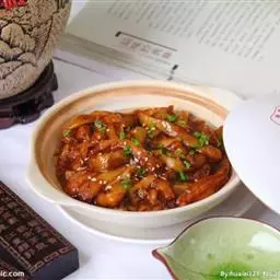 1、将鸡腿或一整只鸡洗净改成丁放入碗中用盐、料酒码味,微炸成型。