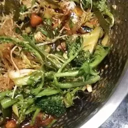 我们将所有食材翻炒均匀,也差不多快熟了(在翻炒中要火大,动作要快,这样出锅才香),就可以最后的调味了,加入味精、鸡精、生抽,尝一下,味道淡了再加点生抽,不要加盐。最后在出锅前,淋入一点香油、藤椒油。