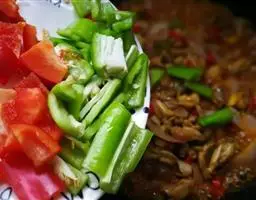 12.锅里留些底油,倒入干辣椒和尖辣椒炒香。