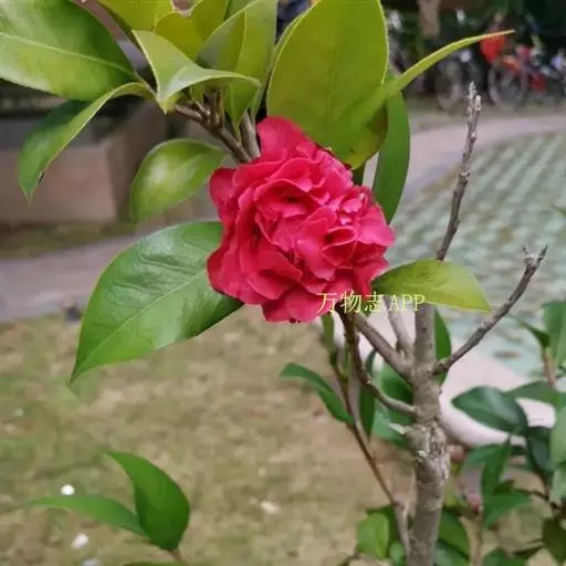 红牡丹:山茶的栽培品种。叶椭圆形,先端尖,略下乖,叶缘具细锐锯齿。花粉红色或红色。花期3-4月。