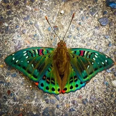 孔雀蛱蝶展翅宽50~60mm。翅膀表面红色,上、下翅有一大型彩色眼纹;翅膀腹面淡褐色,拟似烟熏枯叶…