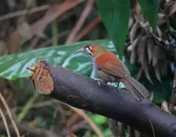 黑顶噪鹛:中型鸟类,体长24-26厘米。前额、脸、颏、喉黑色,头顶黑褐沾棕或深棕橄榄褐色,…