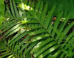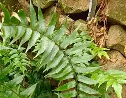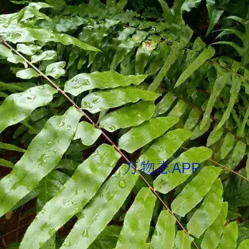 叶簇生,柄长10-30厘米,粗达4毫米,坚实,上面有纵沟,下面圆形,灰褐色或淡褐棕色,略有光泽,基部被披针形鳞片及纤维状鳞片;叶片通常长70-80厘米或超过1米,宽14-30厘米,狭椭圆形,一回羽状,羽片多数(约35-50对),互生,偶有近对生,相距1.5-3厘米,有极短柄或近无柄,以关节着生于叶轴,叶轴两侧疏被柔毛,中部羽片披针形或线状披针形,长9-15厘米,宽1-2.5厘米,先端急尖或短渐尖,基部近对称,近圆形或斜截形,叶缘有疏缺刻或粗钝锯齿,主脉两面均明显,侧脉纤细,自主脉斜向上,二至四叉,达叶边附近;下部羽片披针形,较短,先端短尖。叶薄纸质或纸质,干后褐绿色,两面均无毛,幼时两面均略被披针形小鳞片或线形的纤维状鳞片,尤以主脉下面较密,成长时部分或全部脱落。