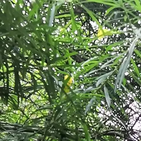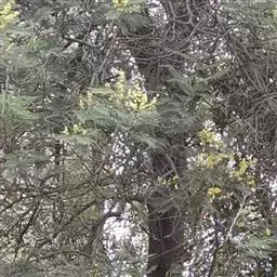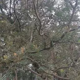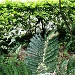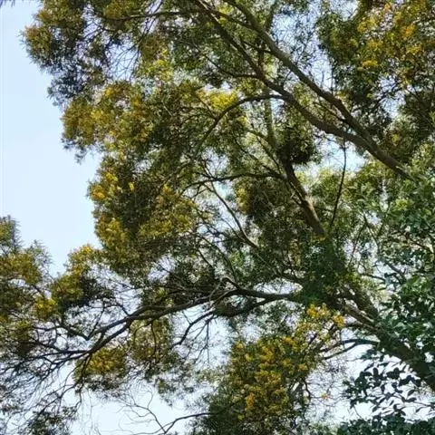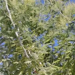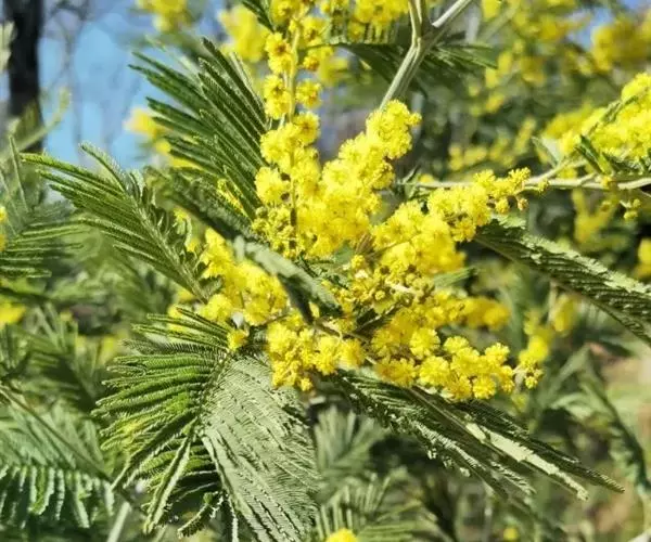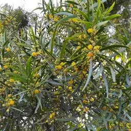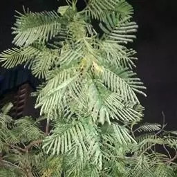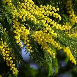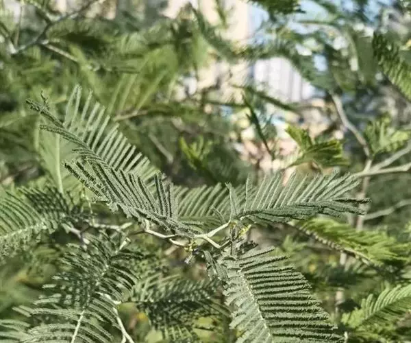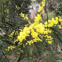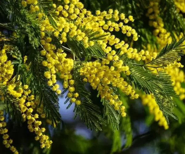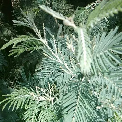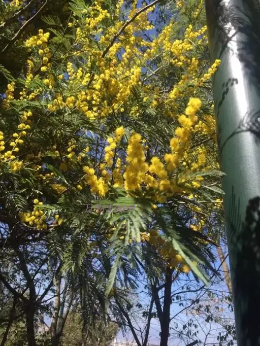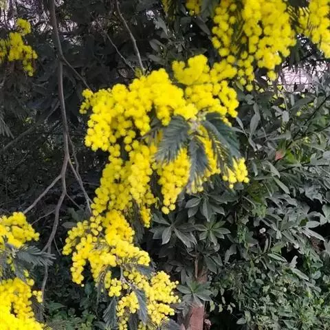 银荆(学名:Acacia dealbata Link),被子植物豆科常绿乔木,高约25米,树干较直,树皮灰绿或灰色;二回羽状复叶,偶数,小叶线形,银灰色或浅灰蓝色。3~4月开花,头状花序,具小花30-40朵,花黄色,有香气。荚果长带形,长3.5-11厘米,果皮暗褐色,密被绒毛。种子卵圆形,黑色,有光泽。