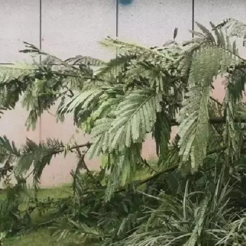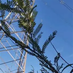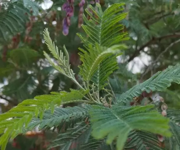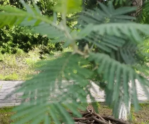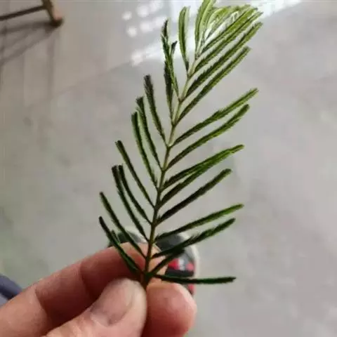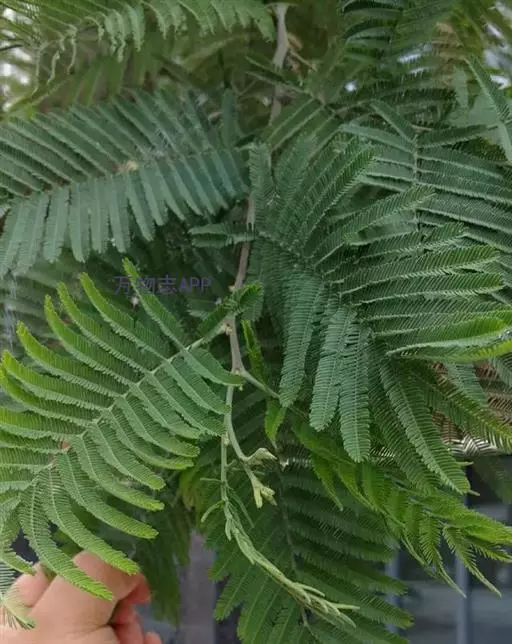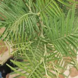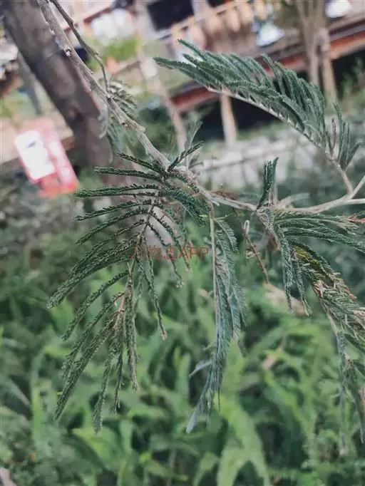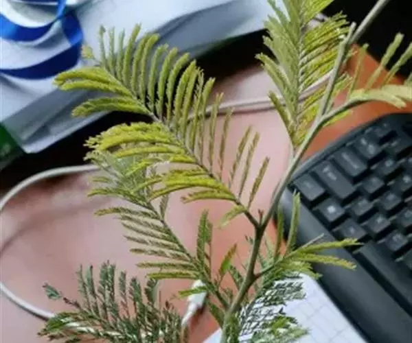 无刺灌木或小乔木,高15米;嫩枝及叶轴被灰色短绒毛,被白霜。二回羽状复叶,银灰色至淡绿色,有时在叶尚未展开时,稍呈金黄色;腺体位于叶轴上着生羽片的地方;羽片10-20(-25)对;小叶26-46对,密集,间距不超过小叶本身的宽度,线形,长2.6-3.5毫米,宽0.4-0.5毫米,下面或两面被灰白色短柔毛。