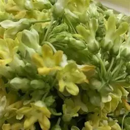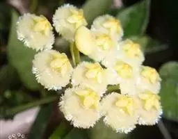 聚伞花序长约5厘米;总花梗长0.5-1.5厘米;花梗长约1厘米;萼片阔卵形或卵形,顶端钝,比花冠筒短,被微柔毛,内面基部有腺体;花冠漏斗状,白色、浅黄色或粉红色,花冠筒长5毫米,裂片长圆形,顶端钝,长约1.5厘米,宽7毫米;副花冠分裂为10鳞片,呈流苏状,比花药长或等长,其中5枚鳞片生于花冠裂片上,与裂片对生,长8毫米,顶端通常有3个小齿,其余5枚鳞片生于花冠筒顶端与花冠裂片互生,长6毫米,顶端2深裂;雄蕊伸出花喉之外,花药箭头状,被短柔毛;子房由2枚粘生心皮组成,无毛,花柱丝状,向上逐渐增大,柱头卵形。