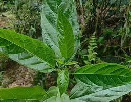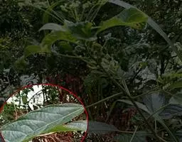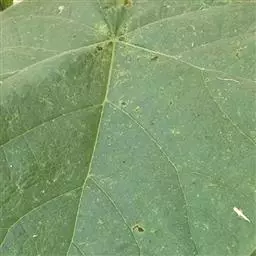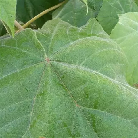 叶片长卵状心脏形,有时为卵状心脏形,长达20厘米,顶端长渐尖或锐尖头,其凸尖长达2厘米,新枝上的叶有时2裂,下面有星毛及腺,成熟叶片下面密被绒毛,有时毛很稀疏至近无毛;叶柄长达12厘米。