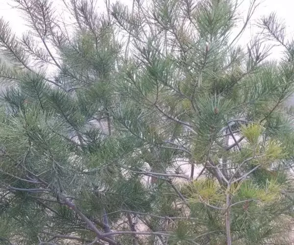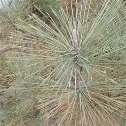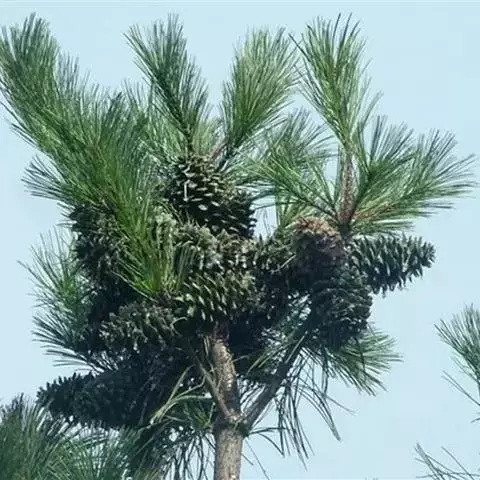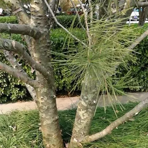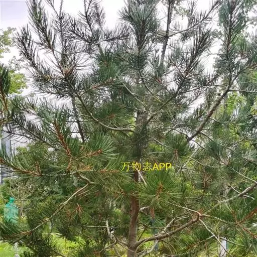 乔木,高达30米,胸径可达3米;有明显的主干,或从树干近基部分成数干;枝较细长,斜展,形成宽塔形至伞形树冠;幼树树皮光滑,灰绿色,长大后树皮成不规则的薄块片脱落,露出淡黄绿色的新皮,老则树皮呈淡褐灰色或灰白色,裂成不规则的鳞状块片脱落,脱落后近光滑,露出粉白色的内皮,白褐相间成斑鳞状;一年生枝灰绿色,无毛;冬芽红褐色,卵圆形,无树脂。针叶3针一束,粗硬,长5-10厘米,径1.5-2毫米,叶背及腹面两侧均有气孔线,先端尖,边缘有细锯齿;横切面扇状三角形或宽纺锤形,单层皮下层细胞,在背面偶尔出现1-2个断续分布的第二层细胞,树脂道6-7,边生,稀背面角处有1-2个中生;叶鞘脱落。雄球花卵圆形或椭圆形,长约l厘米,多数聚生于新枝基部成穗状,长5-10厘米。