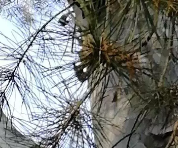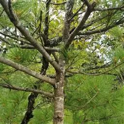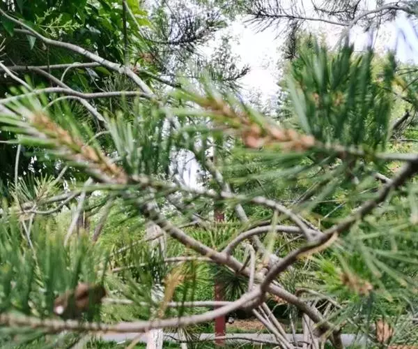 危害特征:松梢螟成虫灰褐色,幼虫淡褐色到淡绿色。松梢螟可钻蛀白皮松主梢,让松梢枯死,引发侧梢丛生。侧梢的向上生长,可能导致树干弯曲,严重者还会引起树干断裂。松梢螟幼虫在被害梢蛀道内或枝条基部伤口越冬。