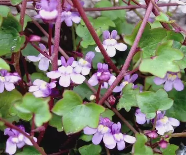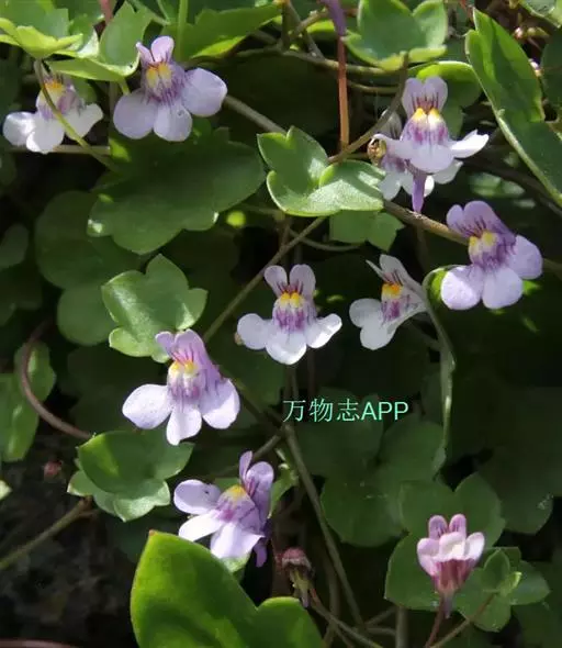 蔓柳穿鱼属(Cymbalaria muralis)蔓柳穿鱼(梅花草、小兔子花、铙钹花),蔓生多年生草 铙钹花 本。茎纤细长达60cm,下部节生细长不定根,单叶互生,叶片心脏圆形或圆肾形半圆形,长0.8~2.5cm,宽1.2~3cm,掌状5~7裂,裂片深达叶片1/3,有时侧裂片又2浅裂,裂片先端具短尖头,叶基深心形,叶柄细弱,长为叶片的2~3倍。花单生叶腋,花梗细,长1.5-2.5cm,花萼5裂,达基部,裂片披针形,长2~2.5mm;花冠蓝紫色或浅蓝色,长9~15mm,花冠筒末端有与萼片等长的短距,上唇二裂,直立,下唇3裂,中裂片隆起呈纵折,封住喉部,纵折呈黄色或白色,具腺毛,雄蕊4,2强;子房球形,花柱单一,柱头细小;种子直径1mm,球形,黑色,具瘤状突起;朔果无毛,长度超过花萼,不规则开裂。