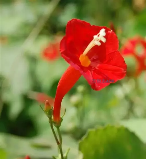 聚伞花序腋生,有花3-6朵,总花梗细弱,较叶柄长,有2苞片,花柄长约1cm,小苞片2;萼片5,不相等,卵状长圆形,钝头,有长芒尖,芒线状,长2mm,着生于萼片顶端稍下方;花冠高脚碟状,橙红色,喉部带黄色,长达8-25mm,管细长,于喉部骤然展开,冠檐5深裂;雄蕊5,显露于花冠之外,稍不等长,花丝丝状,基部肿大,有小鳞毛,花药小;雌蕊稍长于雄蕊;子房4室,每室1胚珠;花柱丝状,柱头头状,2裂。