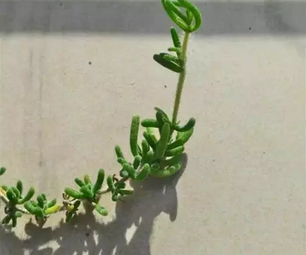 叶绿色,肉质,光线充足时呈红色,长1-2厘米,宽0.3-0.5厘米;对生,基部合生,表面覆盖极小透明玻璃状颗粒,叶先端增粗,紧靠地面的叶基部常萌发根系。