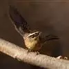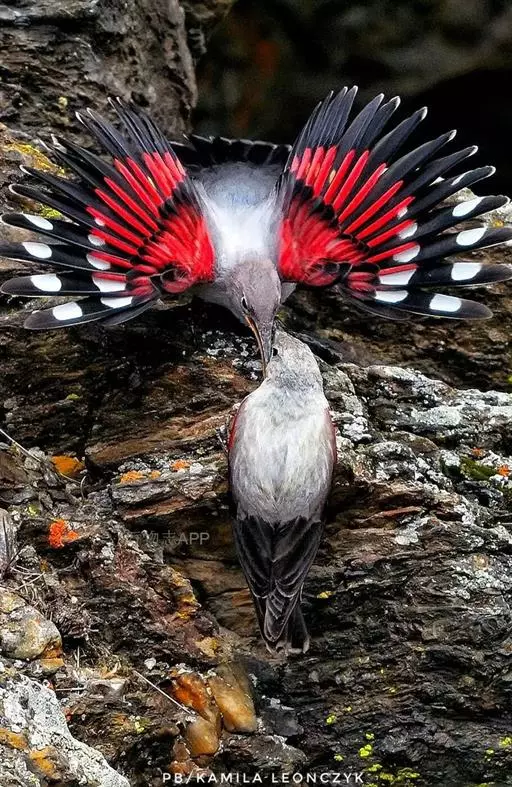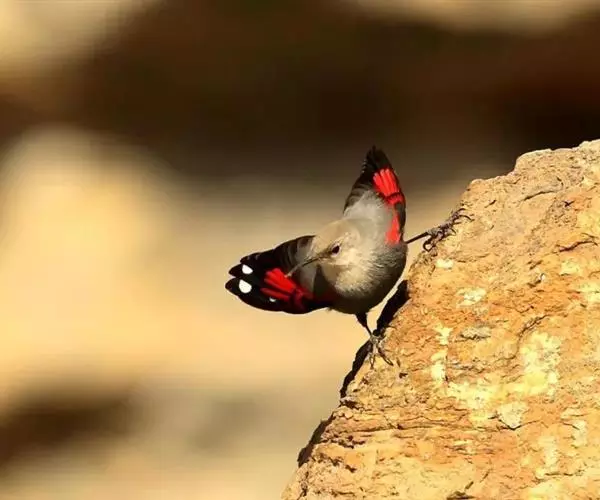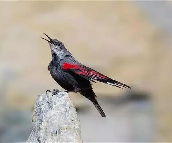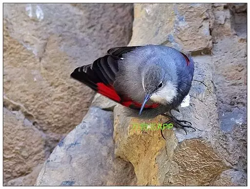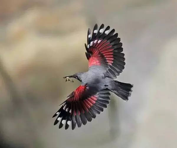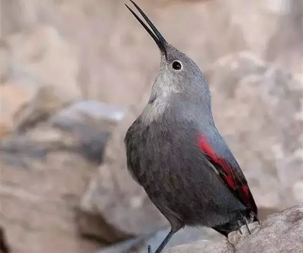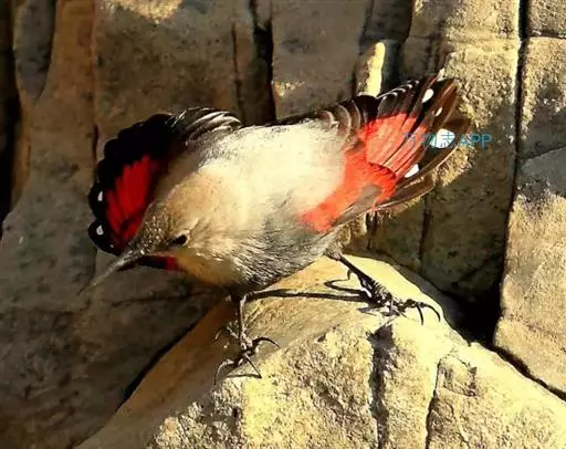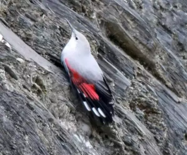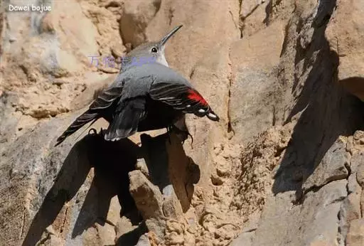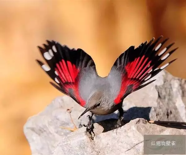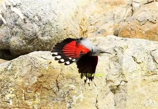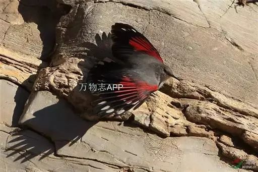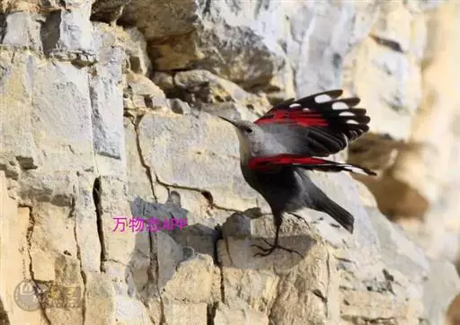 红翅旋壁雀(学名:Tichodroma muraria):体重15-23克,体长120-178毫米。是一种体型略小的鸟类。尾短而嘴长,翼具醒目的绯红色斑纹。飞羽黑色,外侧尾羽羽端白色显著,初级飞羽两排白色点斑飞行时成带状。繁殖期雄鸟脸及喉黑色,雌鸟黑色较少。非繁殖期成鸟喉偏白,头顶及脸颊沾褐。虹膜深褐色,嘴脚黑色。