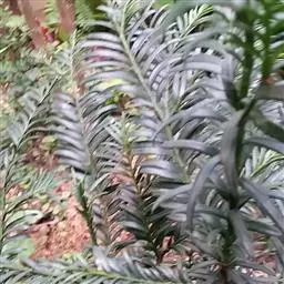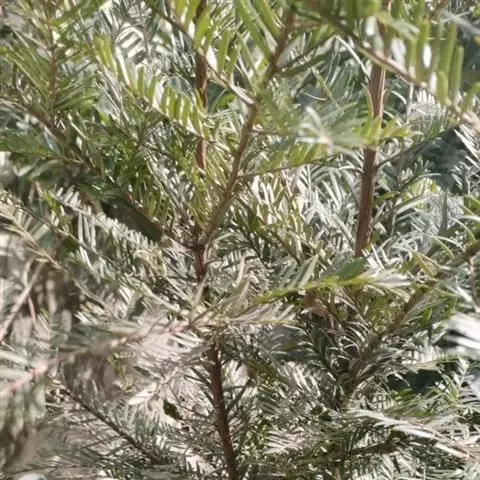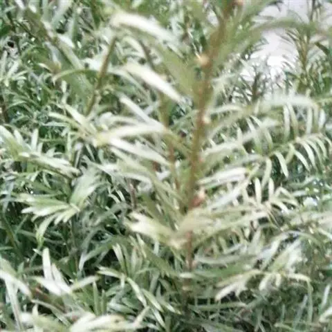 叶排成不规则的二列,斜上伸展,约成45度角,条形,通常直,稀微弯,长1-2.5厘米,宽2.5-3毫米,稀长达4厘米,基部窄,有短柄,先端通常凸尖,上面深绿色, 有光泽,下面有两条灰绿色气孔带,气孔带较绿色边带宽二倍,干后呈淡黄褐色,中脉带上无角质乳头状突起点。雄球花有雄蕊9-14枚,各具5-8个花药。