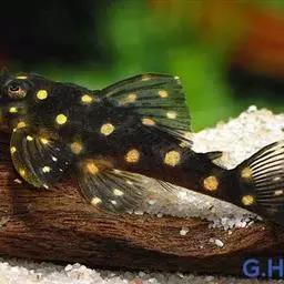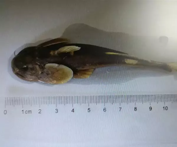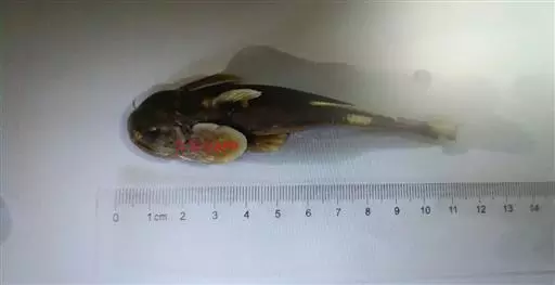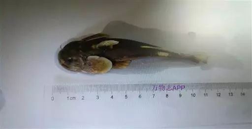 体扁平,头大尾小,头部特别扁平,背鳍起点之前隆起,体后部侧扁。口宽大,下位,稍呈弧形。上下颌具呈带状排列的细齿,分布在整个口盖骨上。唇厚,肉质,有多数乳突和皱褶,稍成吸盘状。须4对,口角须最粗。鳃孔小,位于胸鳍基部上方。眼小,位于头顶,有皮膜覆盖。背鳍不发达,脂鳍长而低,胸鳍大而阔,呈圆形,吸盘状,富肉质。胸、腹鳍第一根软鳍条很发达,变得十分肥大。臀鳍短小,尾鳍截形;体无鳞。背部和尾部黑褐色,腹部白色。