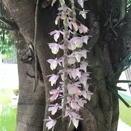 花瓣线状倒披针形,长4.2—6厘米,宽10—15毫米,稍长于中萼片,先端近急尖;唇瓣宽卵状椭圆形至近圆形,长4—5.5厘米,宽3—4.6厘米,不明显3裂,淡粉红至白色,先端微缺,边缘有须毛,上部边缘撕裂状,上面具2—5条褶片,中央1条褶片短或不存在;褶片常有间断,全缘或啮蚀状;蕊柱长2.8—4.2厘米,具有四个花药,顶部多少膨大并具齿;蒴果纺锤状,长4厘米,黑褐色;种子细小,量多。花期3—4月。