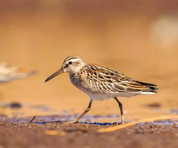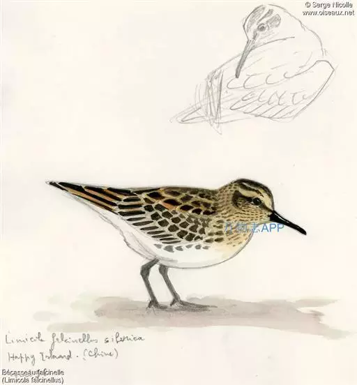 阔嘴鹬是涉禽,体长17厘米。特征为翼角常具明显的黑色块斑并具双眉纹。与黑腹滨鹬平滑下弯的嘴相比,…
