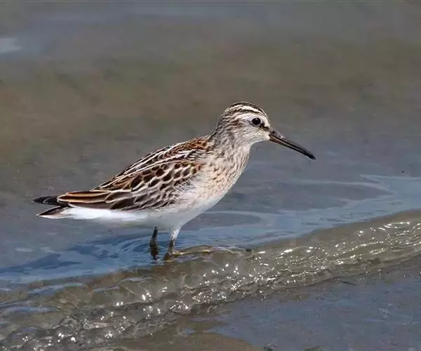 阔嘴鹬(学名:Limicola falcinellus)是涉禽,体长17厘米。特征为翼角常具明显的黑色块斑并具双眉纹。与黑腹滨鹬平滑下弯的嘴相比,阔嘴鹬的嘴具微小纽结,使其看似破裂。上体具灰褐色纵纹;下体白,胸具细纹;腰及尾的中心部位黑而两侧白。冬季与黑腹滨鹬区别在于眉纹叉开,腿短。与姬鹬易混淆,但嘴不如其直,肩部条纹不甚明显。性孤僻,喜潮湿的沿海泥滩、沙滩及沼泽地区。翻找食物时嘴垂直向下。遇警时蹲伏。繁殖于欧亚大陆北部,从斯堪的纳维亚半岛往东到西伯利亚北部,南到中亚吉尔吉斯、叶尼塞河和东西伯利亚南部。越冬于地中海、红海、印度、中南半岛和澳大利亚。