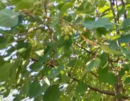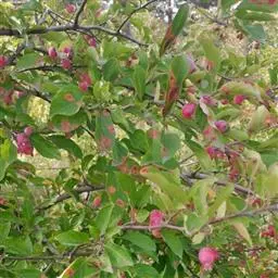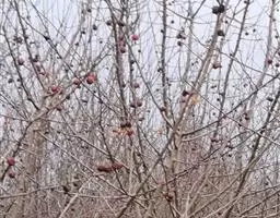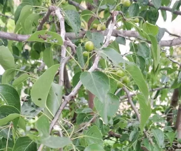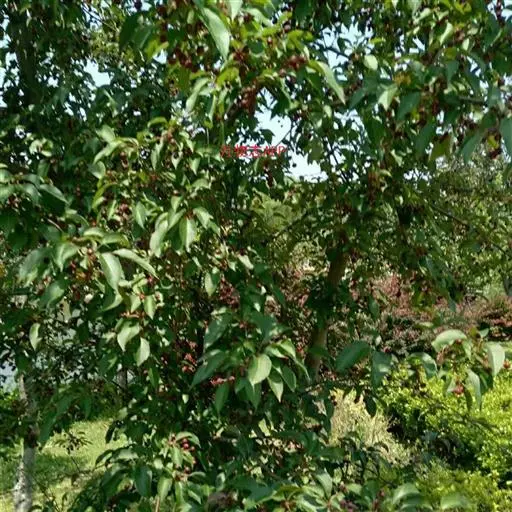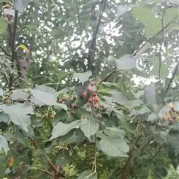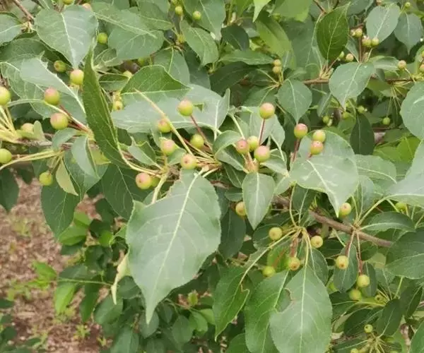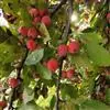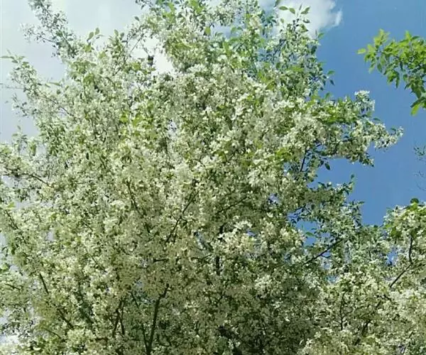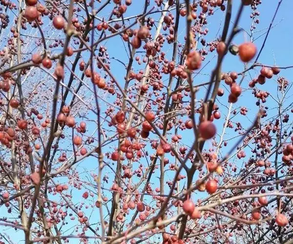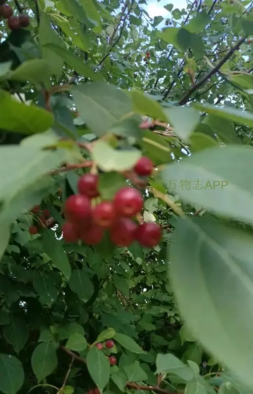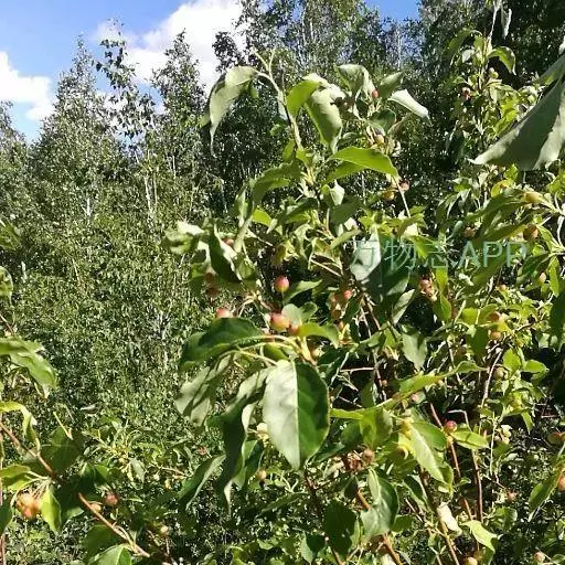山荆子(学名:Malus baccata (L.) Borkh.):为落叶乔木,树高可达4-5米,最高可达10米以上。灰褐色,光滑,不易开裂。新梢黄褐色,无毛。嫩梢绿色微带红褐。叶片椭圆形,先端渐尖,基部楔形,叶缘锯齿细锐。伞形总状花序。花白色,花柱5或4,基部有长柔毛。4-6朵花集生在短枝顶端。6月开花,果近球形,直径0.8-1厘米,红色或黄色,脱萼,萼洼有圆形绣斑,果柄长为果实的3-4倍。果实9月中、下旬成熟,出种率4.4%。种子小,千粒重6.7克,每千克14-15万粒。