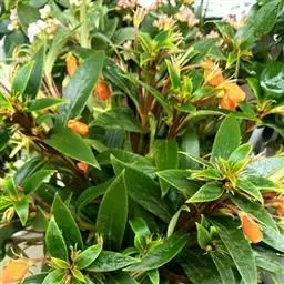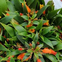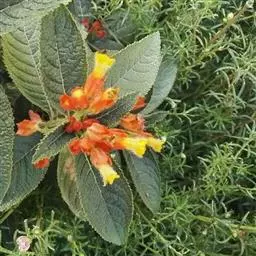 叶片生于枝条上部,椭圆形或长椭圆形,交互对生,全缘,先端尖,绿色,叶长8至12厘米,宽4至6厘米,叶表密生厚实的白色绒毛,有光泽。花生于枝顶端,数朵群聚开放,花筒较细,长3至4厘米,直径约2厘米,花瓣先端稍微弯曲,橙红色或朱红色,外被白色绒毛,春末至初秋开放,4至5月开花最盛。