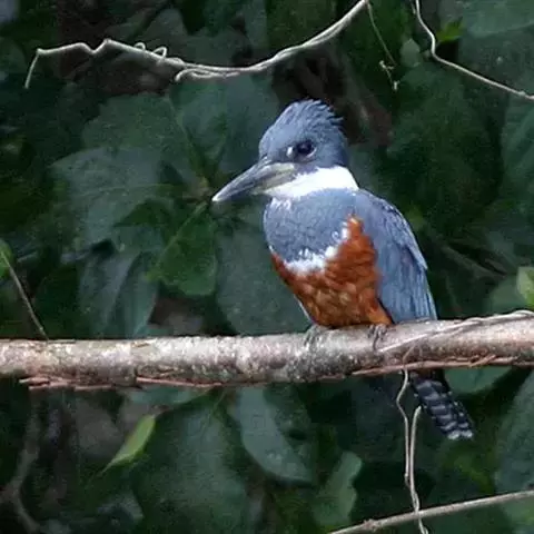 棕腹鱼狗身长38 - 42 cm ,体重305-341 g。主体羽毛蓝色。头顶的冠羽竖起一个小尖峰…