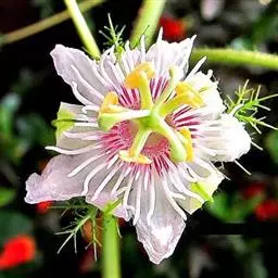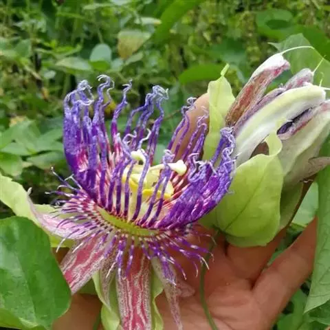 花序退化仅存1花;与叶柄对生,卷须粗壮;花梗三棱形,长1-3厘米,中部具关节;苞片叶状,卵形,长3-5厘米,顶端急尖,基部心形;花大,直径6-8(-10)厘米,淡红色,芳香;萼片5枚,卵形至卵状长圆形,长3-4厘米,外面绿色,被疏毛,内面玫瑰红色;花瓣5枚,淡红色,长圆形或长圆状披针形,长与宽同萼片;外副花冠裂片5轮,丝状,白色或紫色,外2轮裂片特长,约3-5厘米,第3轮裂片头状或棒状,长约2毫米,第4轮裂片丝状,长1-2毫米,第5轮膜质,边缘撕裂状,长4-5毫米;内副花冠膜质,似第5轮外副花冠;具花盘,杯状;雄蕊5枚,分离;子房卵球形;花柱紫色,柱头3裂。浆果卵球形,长20-25厘米,肉质,熟时红黄色;种子多数,近圆形,直径7-9毫米,扁平。花期2-8月。2-5月植株零星开花,6-8月植株大量开花。从种子萌发到开花约1年时间,花在每天上午7时左右就开放,花开放时浓香,色彩艳丽,天黑时闭合,次日呈萎蔫状。 [1-2]