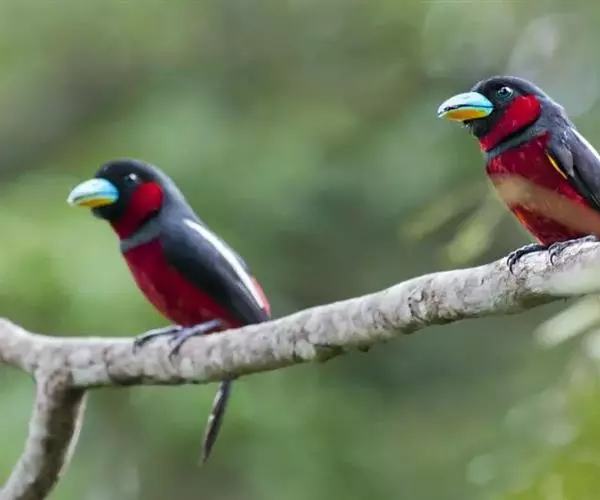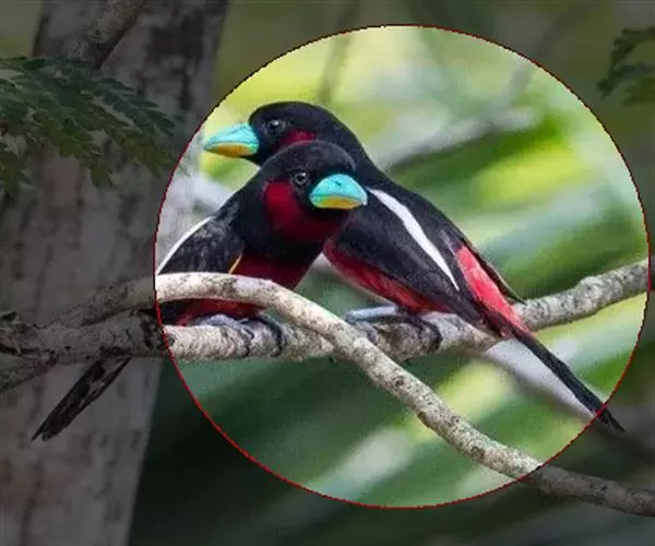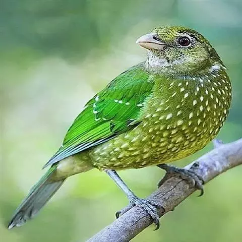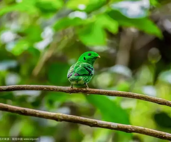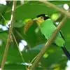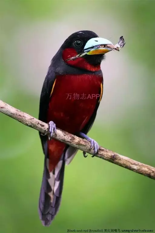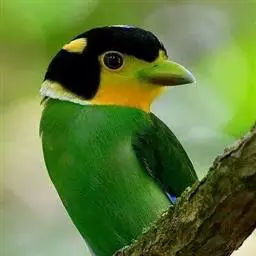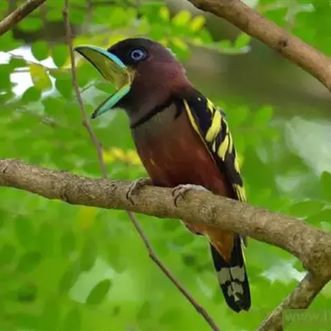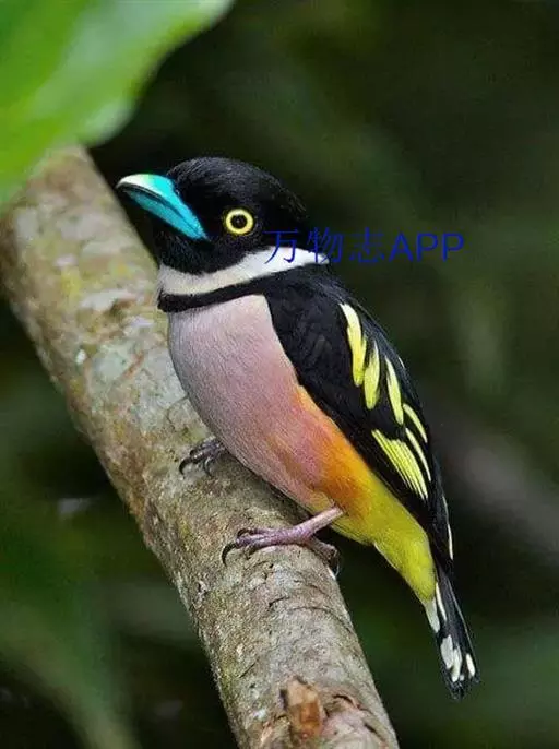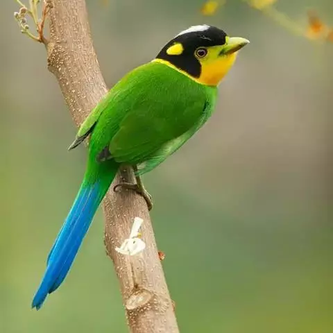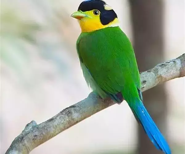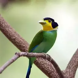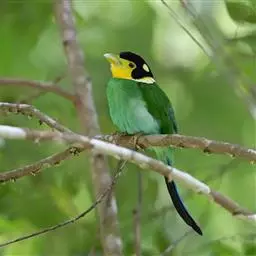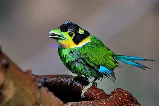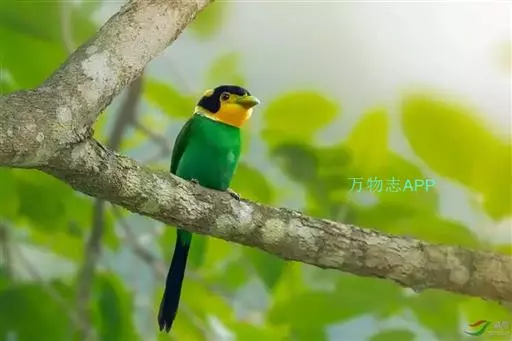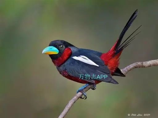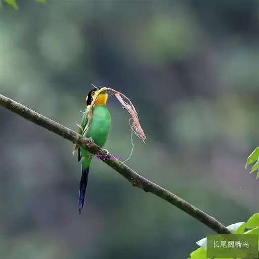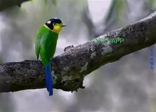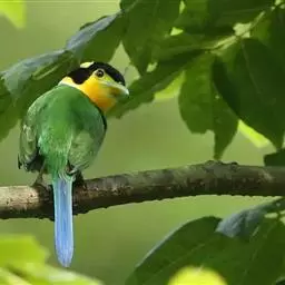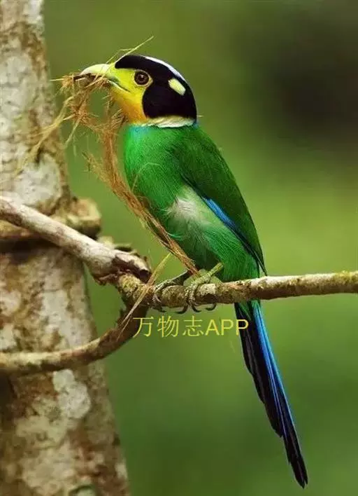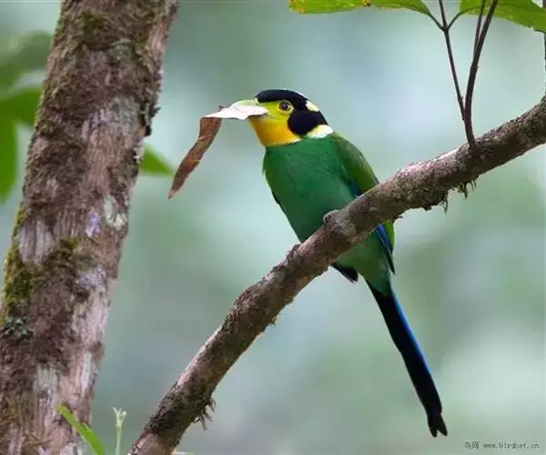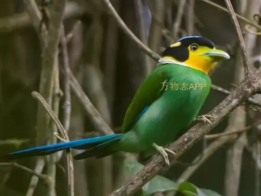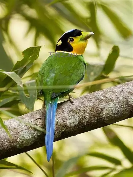 长尾阔嘴鸟是雀形目阔嘴鸟科的鸟类,体长约25厘米,是绿色阔嘴鸟。形长的楔形尾蓝色,喉及脸黄色,顶冠…