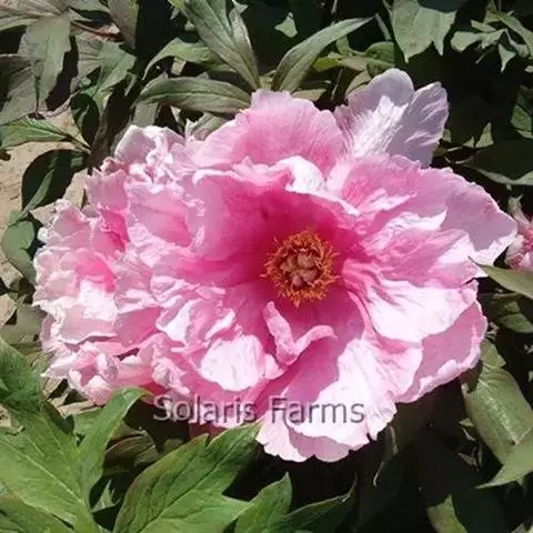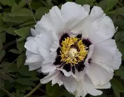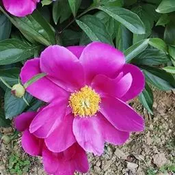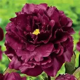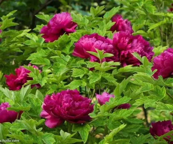 花朵蔷薇型。花蕾圆尖形。花紫红色,有光泽;花径17厘米×9厘米。花瓣多轮质硬,排列整齐,基部具墨紫色斑;部分雄蕊常有瓣化现象;雌蕊多而小,房衣暗紫红色,偶有结实。花梗较长而硬,花朵直上。中开花品种。