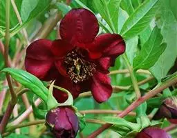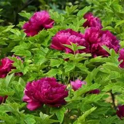 洛阳红(学名:Paeonia suffruticosa cv. 'Luoyang Red'):牡丹品种,落叶灌木。株型高,直立。分枝较细而硬。叶宽卵形,表面绿色,无毛,背面淡绿色,有时具白粉,沿叶脉疏生短柔毛或近无毛。花单生枝顶,苞片5,长椭圆形,大小不等;萼片5,绿色,宽卵形,大小不等;花朵蔷薇型。花蕾圆尖形。花紫红色,有光泽。花丝上部白色,花药长圆形,花盘革质,杯状,紫红色;心皮5,密生柔毛。蓇葖长圆形,密生黄褐色硬毛。花期5月;果期6月。
